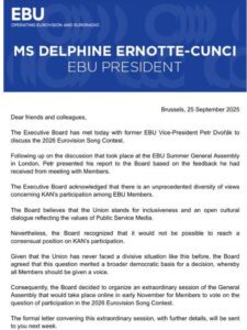 The EBU Executive Board announced the extraordinary online General Assembly meeting after acknowledging “unprecedented diversity of views” among its 68 member broadcasters regarding Israel’s participation. The vote will require only a simple majority (more than 50% of votes cast) to exclude Israel, despite Israeli broadcaster KAN’s claims that EBU statutes require a 75% supermajority for “extraordinary decisions”.