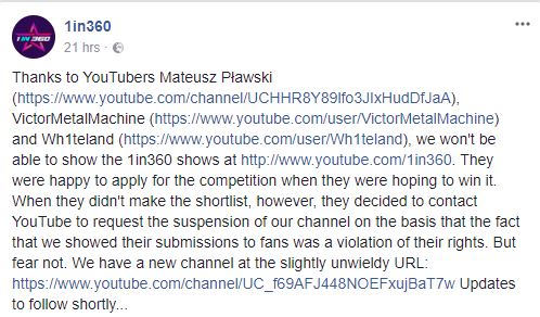 Fuck’s sake people … that takes whinging to a whole new level! If this were any other broadcaster, we’d be laughing at them … and we frankly are, but what is worse here is not the amateur hour at 1in360 but, in our opinion, the “fans” that tried and failed to get shortlisted!