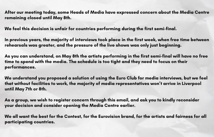 Complaints have come from eight (unnamed) broadcasters participating in the first semifinal. They feel their performers are being disadvantaged by a decision to lock the media out of first rehearsals and not hold press conferences during the first days of on-site preparations in Liverpool.
