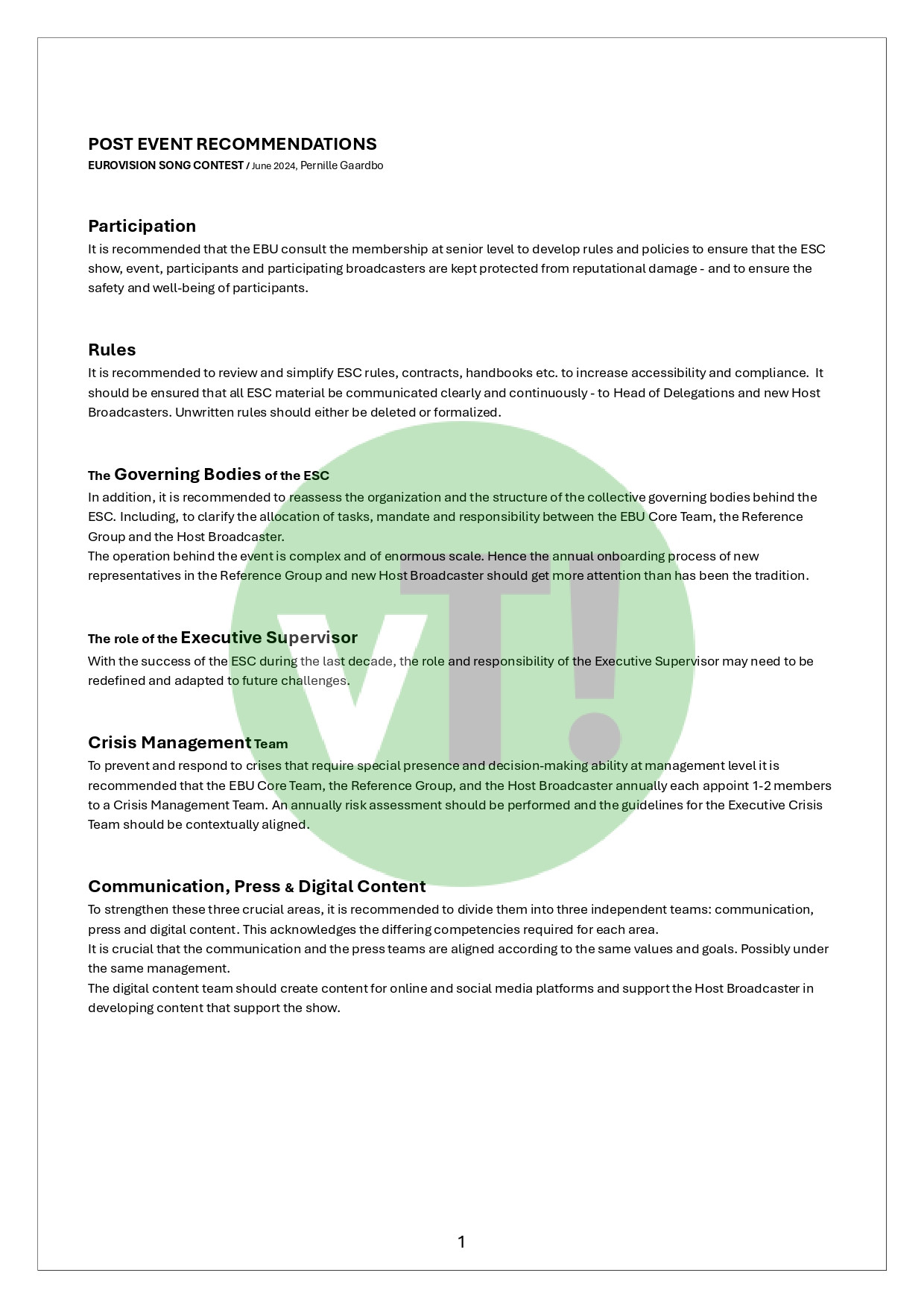 Finally, Gaardbo’s report called for the formation of a cross-EBU/host broadcaster crisis team, with annual risk assessments and clear guidelines, along with improved communication, dividing teams by specialism, ensuring aligned messaging, and supporting host broadcasters in digital content.
