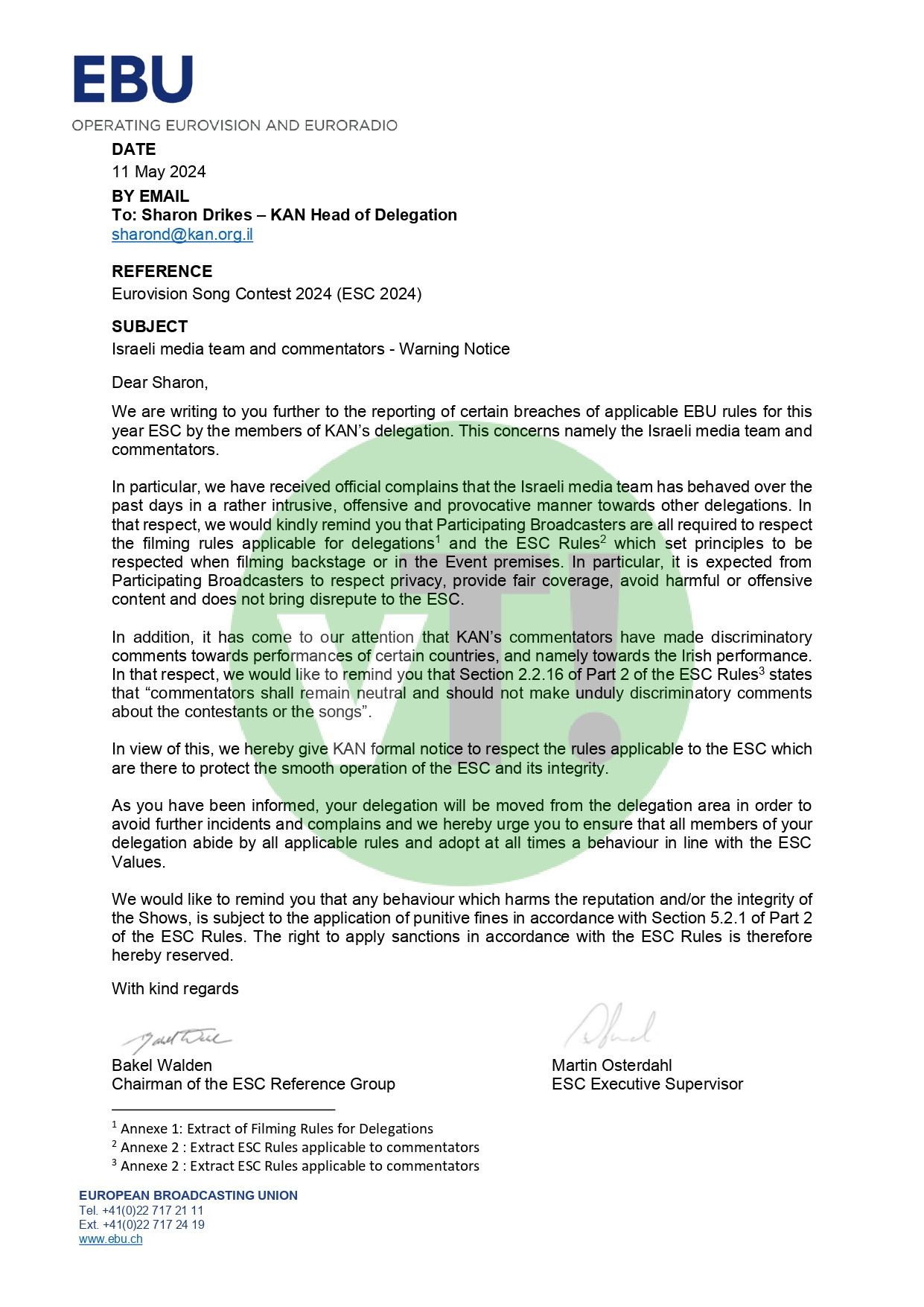 Following events in Malmo, the EBU issued a sternly-worded warning to Israel’s broadcaster KAN. The letter, included in the leaked documents, lays out in black and white what many in Malmö’s press room and delegation corridors were already whispering: that the Israeli delegation’s media team and commentators repeatedly breached Eurovision’s strict neutrality rules.