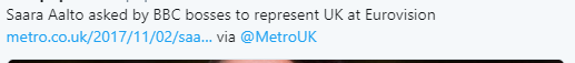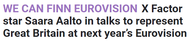Well then. “Saara Aalto asked by BBC bosses to represent UK at Eurovision”? Not quite.