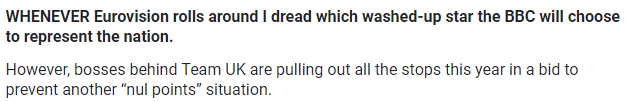 People wonder why the UK doesn’t do better at Eurovision these days. How can it with mainstream journalism like this? Who in their right mind would want to enter a contest and risk their career when any press coverage would be so negative?