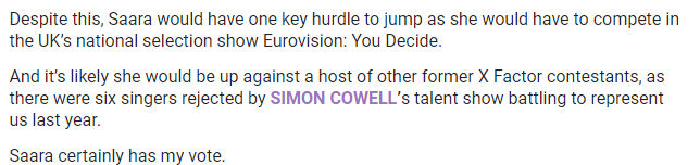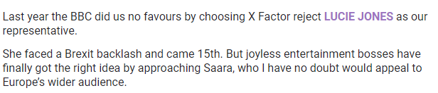 Credit where it’s due, at the very end of this so-called piece of reporting, Amy remembers the national final, where you the public get to pick the song … but don’t worry people, because Saara is Finnish and has a decent voice and someone in The S*N has heard of her, all of our ills will be fixed!