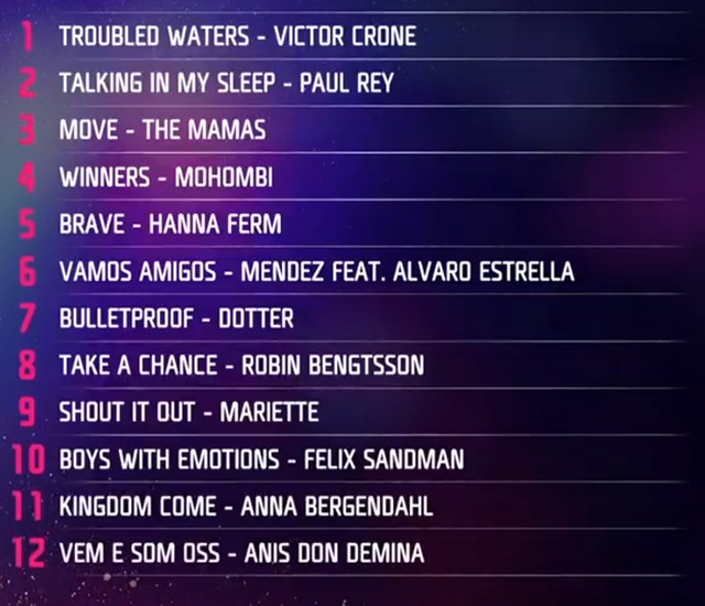 Eight songs lined up, paired into duels. The four that were rated better than their opponents were Anis don Demina with Vem e Som Oss, Paul Rey with Talking in My Sleep, Felix Sandman with Boys With Emotions and Méndez feat. Alvaro’s Vamos Amigos.